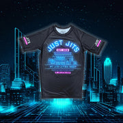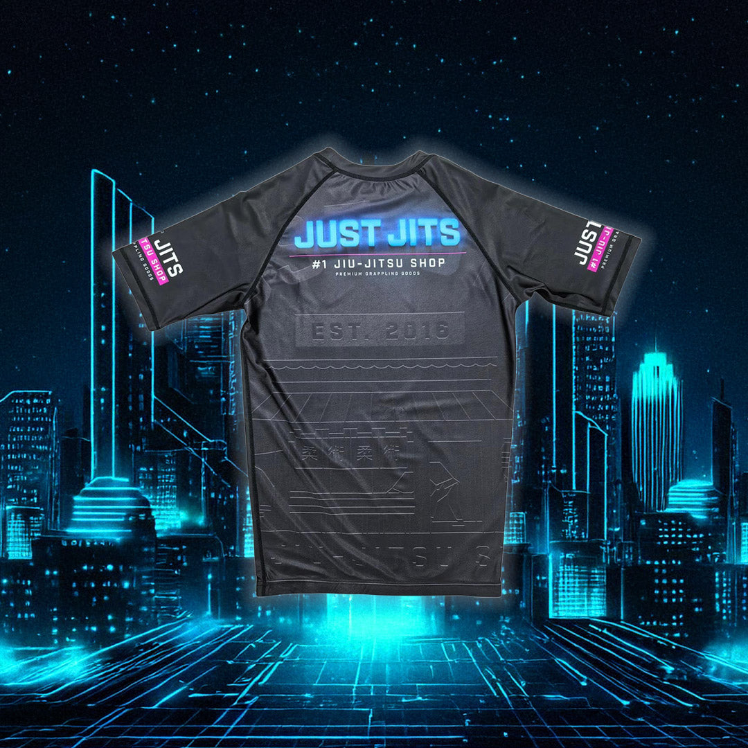 This rashguard features the Just Jits Shop lit up by neon lights. A textured and matte finish is used on this rash guard to add extra depth and a 3D effect to the back print!